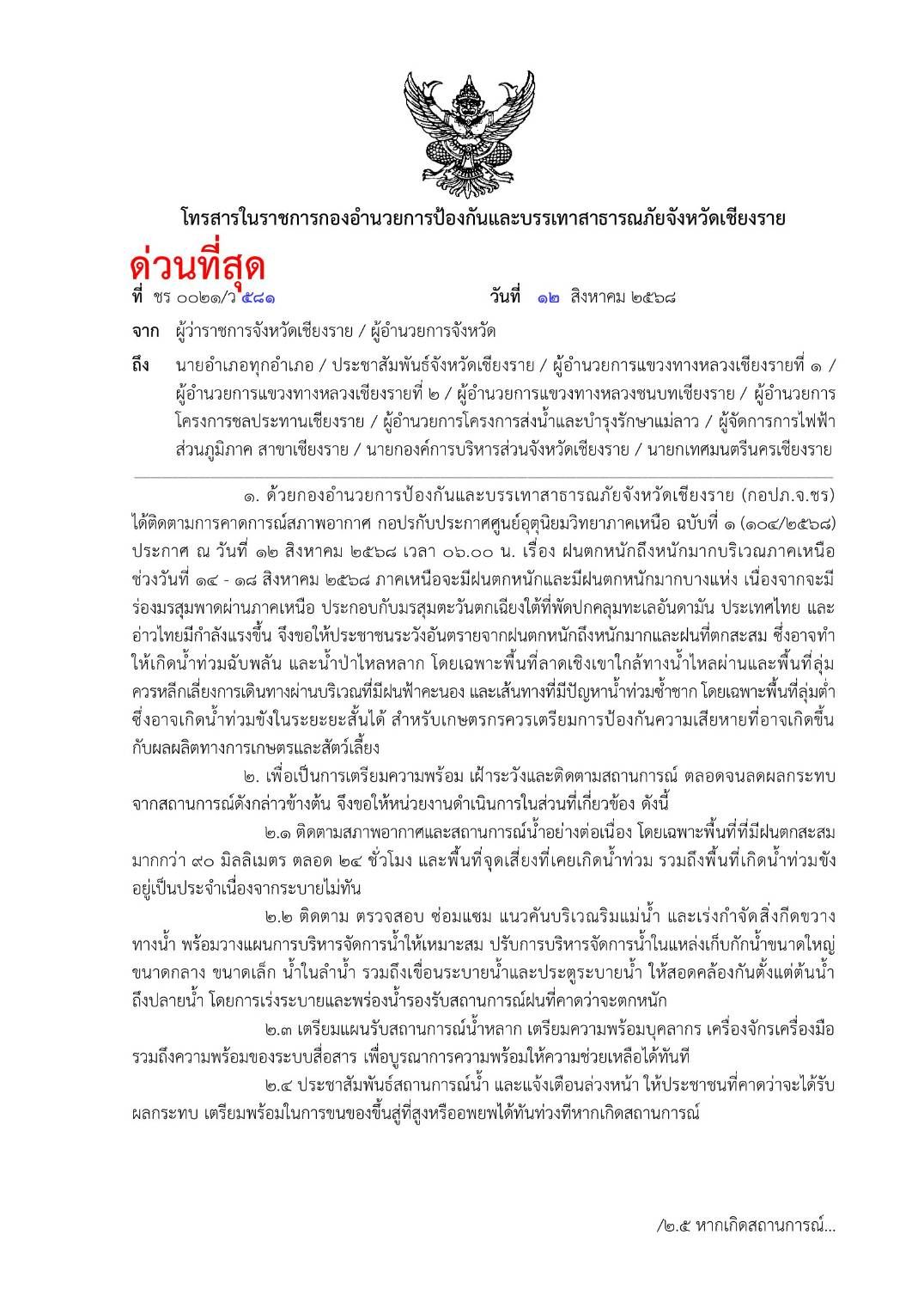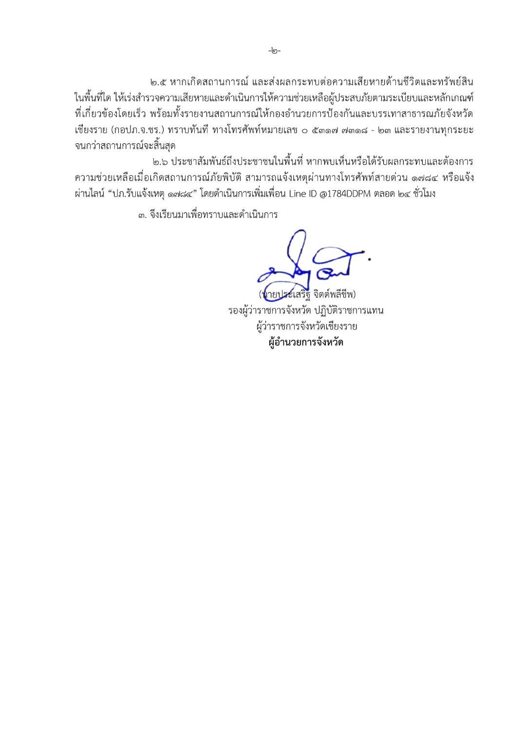ประชาสัมพันธ์แจ้งเตือนฝนตกหนัก ช่วงวันที่ 14 -18 สิงหาคม 2568 วันที่ 13 สิงหาคม 2568 [ 11:55 น. ] เข้าชม 134 ครั้ง พิมพ์ ข่าวประชาสัมพันธ์ ประชาสัมพันธ์แจ้งเตือนฝนตกหนัก ช่วงวันที่ 14 -18 สิงหาคม 2568 #ประกาศเตือน ..!! ระหว่างวันที่ 14 -18 สิงหาคม 2568 ภาคเหนือจะมีฝนตกหนักมากบางแห่ง #ขอให้ประชาชนในพื้นที่ ระวังน้ำท่วมฉับพลัน น้ำป่าไหลหลาก ดอนโคลนถล่ม และระมัดระวังการสัญจรผ่านบริเวณพื้นที่เสี่ยง#แจ้งเหตุด่วน อบต.แม่สลองใน 053-730199 หรือ 097-9203744,089-5267479 (จนท.ป้องกัน) อัลบั้มภาพ