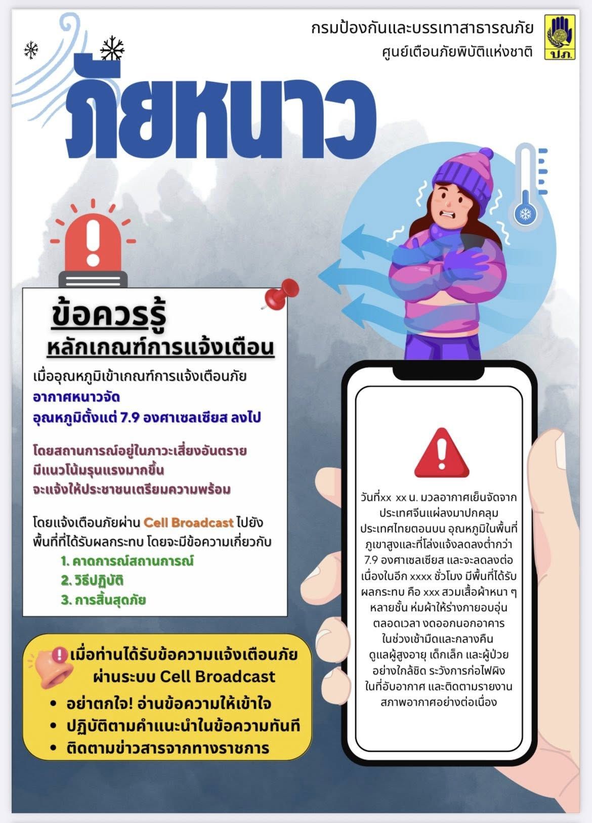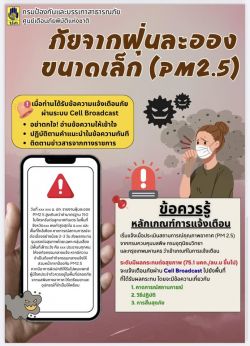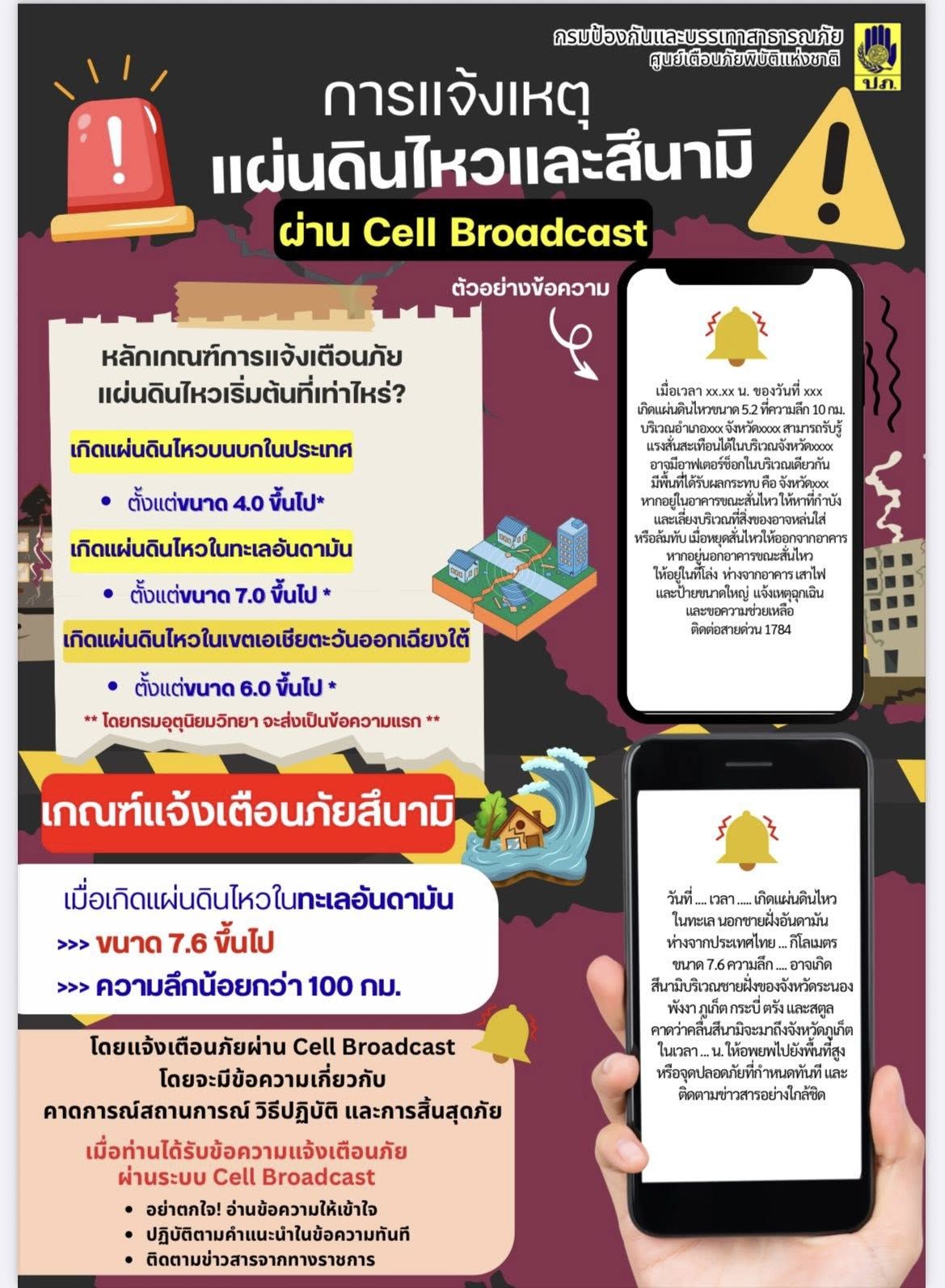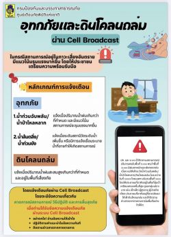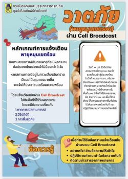 ข่าวประชาสัมพันธ์ Cell Broadcast (การแจ้งเตือนภัยผ่านสัญญาณโทรศัพท์เคลื่อนที่) ของ ปภ. วันที่ 17 ตุลาคม 2568 [ 11:08 น. ] เข้าชม 103 ครั้ง พิมพ์ ข่าวประชาสัมพันธ์ ข่าวประชาสัมพันธ์ Cell Broadcast (การแจ้งเตือนภัยผ่านสัญญาณโทรศัพท์เคลื่อนที่) ของ ปภ. ข่าวประชาสัมพันธ์ Cell Broadcast (การแจ้งเตือนภัยผ่านสัญญาณโทรศัพท์เคลื่อนที่) ของ ปภ. เตือนภัยในสถานการณ์ใดบ้าง ? สถานการณ์ต้องรุนแรงระดับใด ? เมื่อได้รับข้อความแจ้งเตือนภัยควรปฏิบัติตัวอย่างไร ? อัลบั้มภาพ