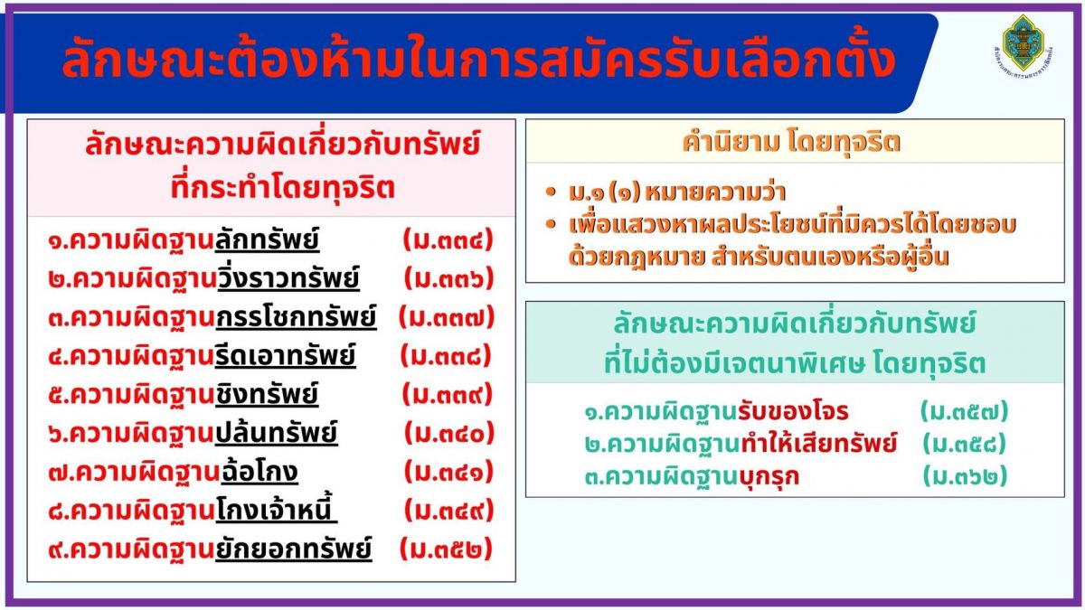 ลักษณะต้องห้ามในการรับสมัครเลือกตั้ง วันที่ 25 พฤศจิกายน 2568 [ 14:22 น. ] เข้าชม 25 ครั้ง พิมพ์ ข่าวประชาสัมพันธ์ ลักษณะต้องห้ามในการรับสมัครเลือกตั้ง อัลบั้มภาพ